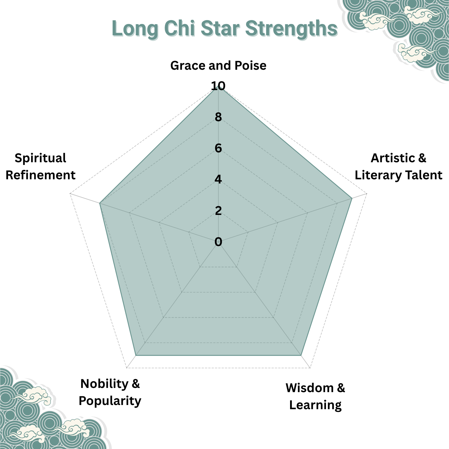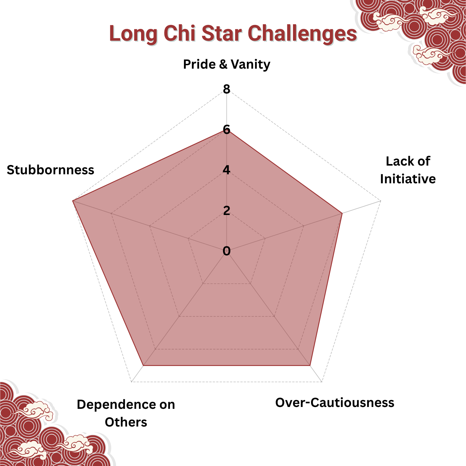 Although blessed with elegance and talent, Long Chi can sometimes foster pride or vanity. Its energy tends toward calm, conservatism, cautious, and composed, yet occasionally lacking initiative or overly reliant on others. When paired with challenging stars, it may also lead to stubbornness or resistance to advice.