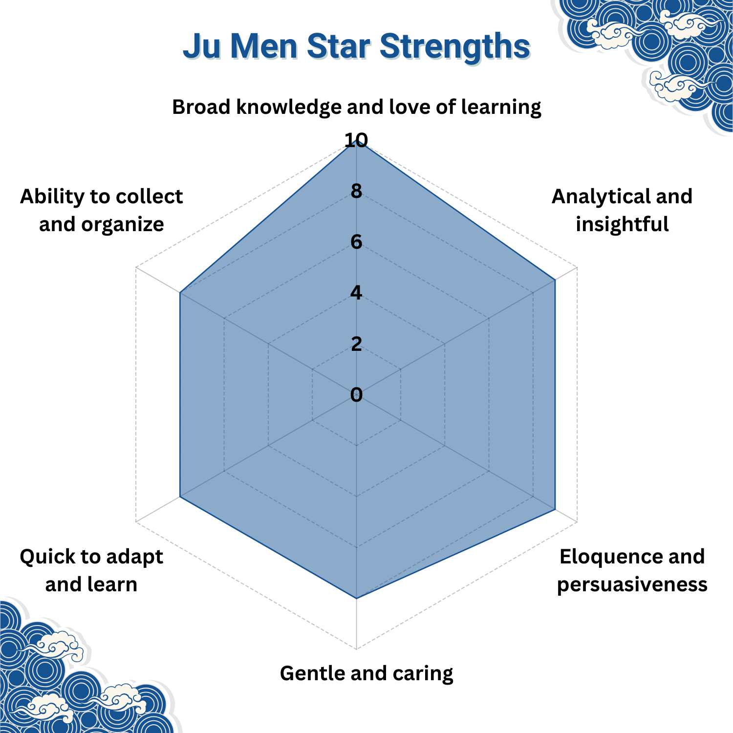 Ju Men natives are bright, curious, and analytical, with strong eloquence and persuasive skills. They are adept at gathering, organizing, and applying knowledge, which becomes a key advantage. Despite a low-key appearance, they are caring and adaptable, often providing genuine support to those around them.