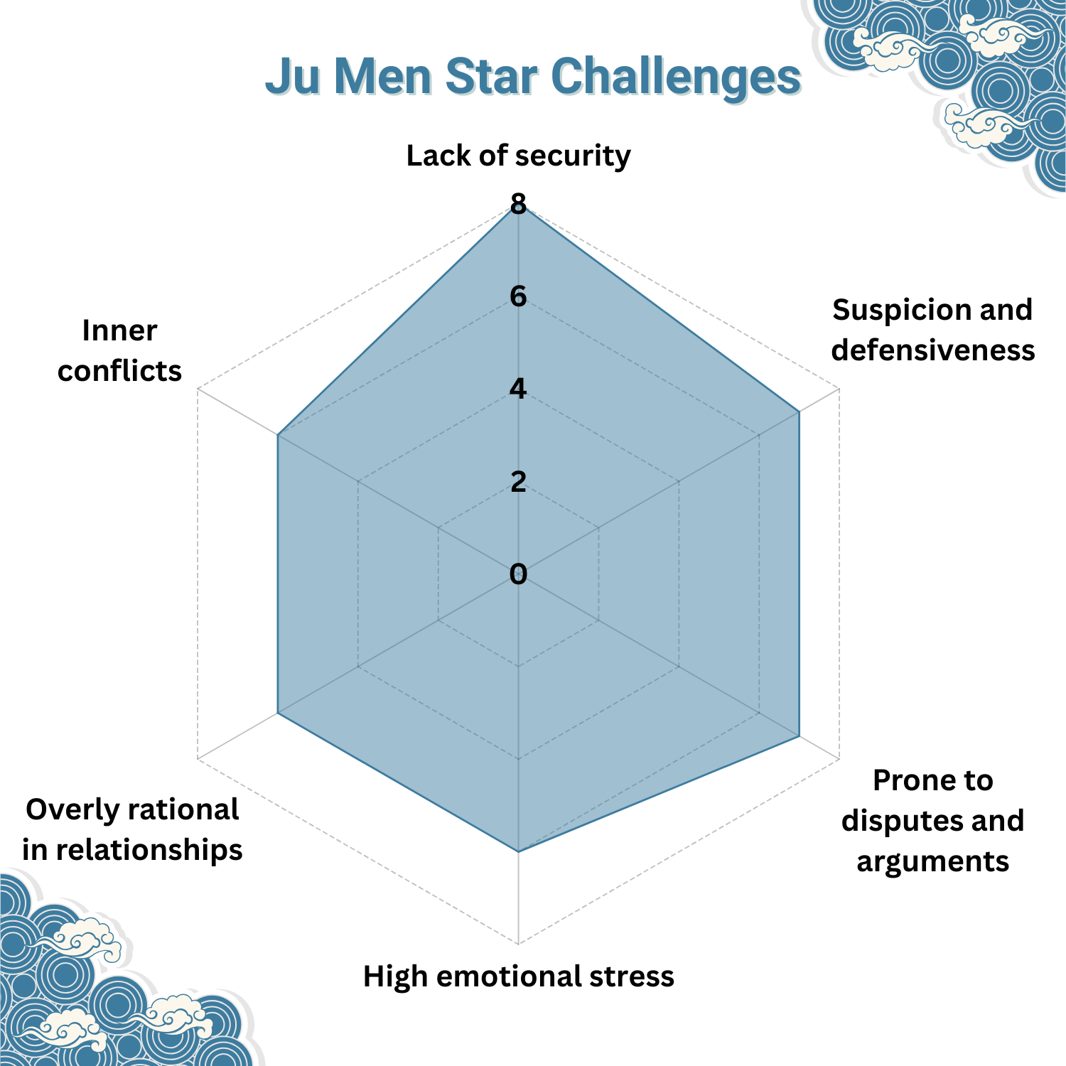 Ju Men’s sensitivity and defensiveness may create misunderstandings in relationships, as their rationality can overshadow emotional warmth. Under stress, they may become blunt, unintentionally hurting others with words. Only by releasing anxiety and balancing reason with empathy can Ju Men fully reveal its wisdom and influence.