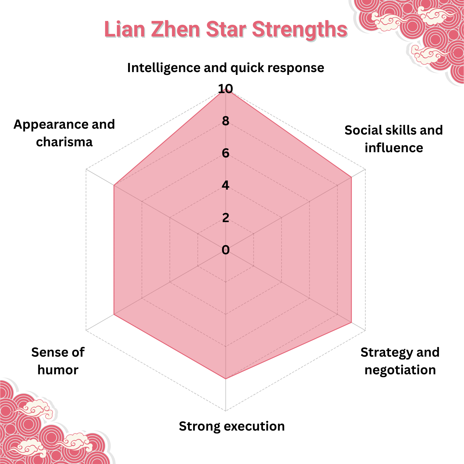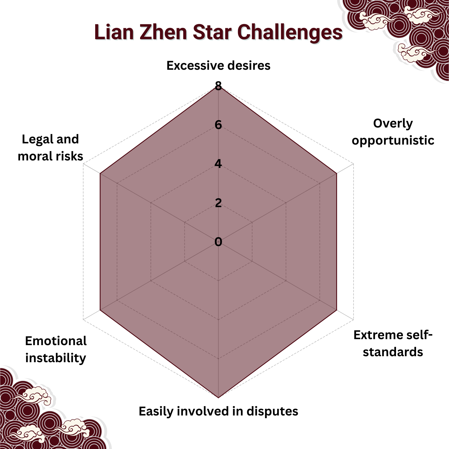 Lian Zhen is inherently dual-natured. It thrives as a capable diplomat and networker, excelling in public relations and business. Without discipline, however, it may lean toward opportunism, indulgence, or even questionable morality. Its essence is the constant pull between self-restraint and the pursuit of influence.