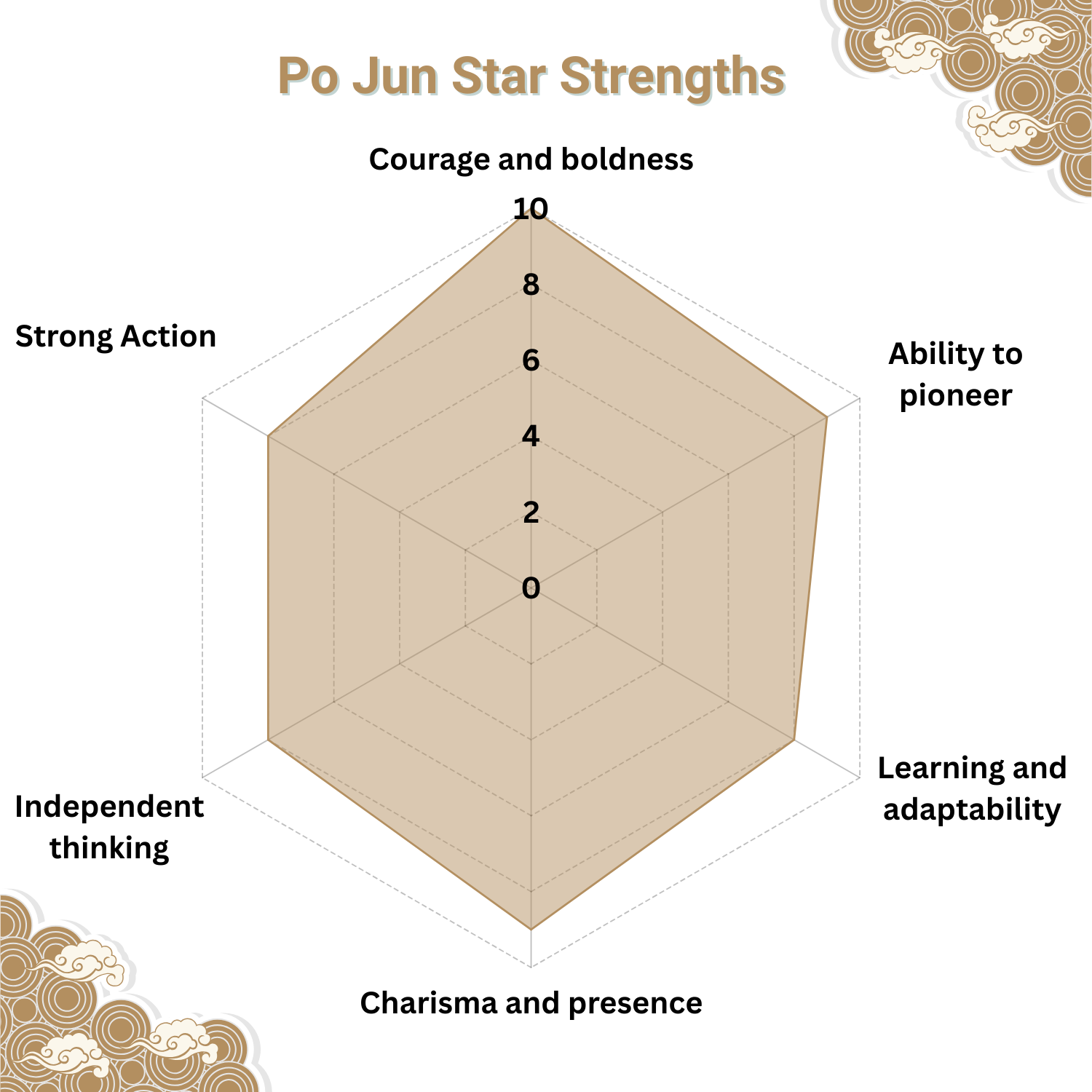Po Jun natives are fearless innovators, daring to break conventions and open new paths. Independent and decisive, with strong action and charisma, they often stand out in times of change, unafraid to pioneer bold ventures. They thrive in fields requiring creativity, risk-taking, and reinvention, often succeeding in unconventional ways.