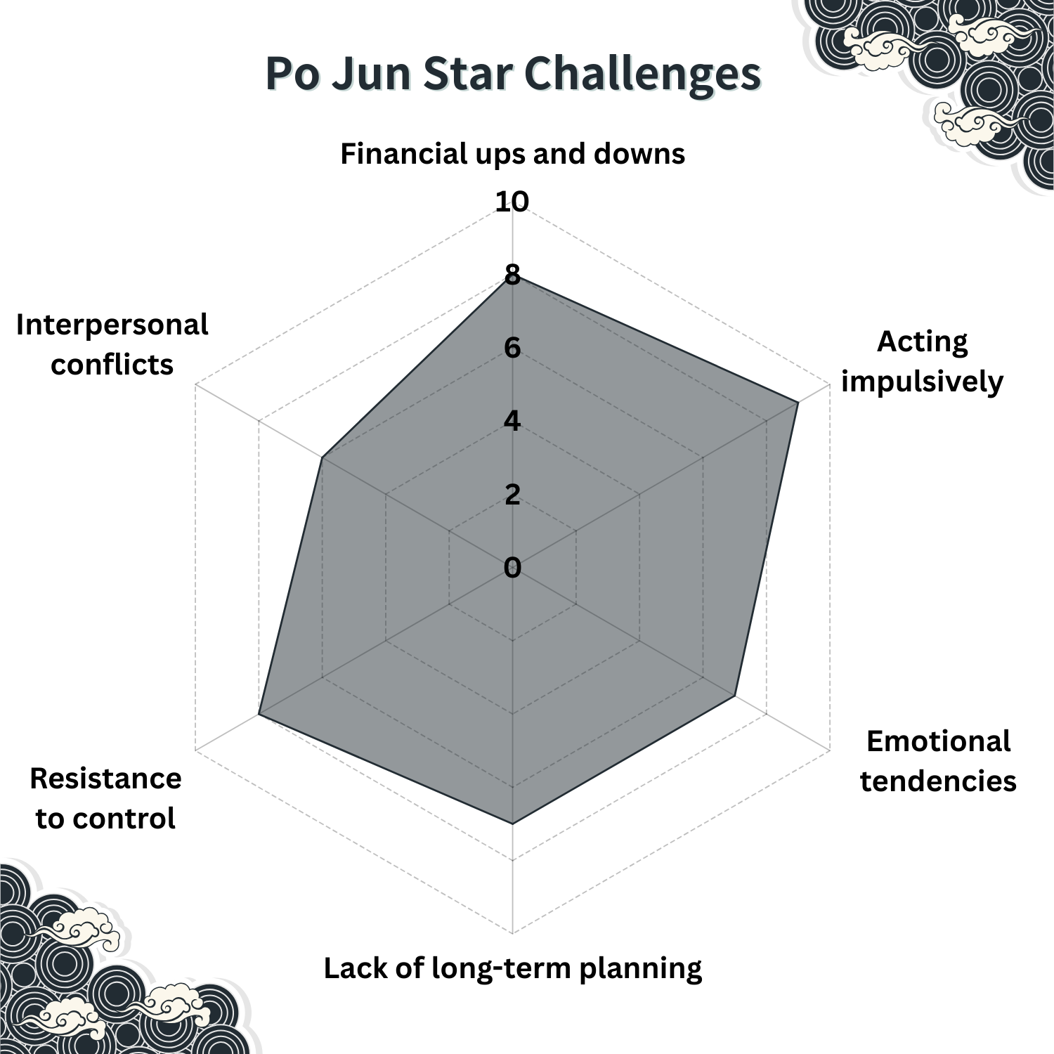 Po Jun’s daring spirit can become impulsiveness without planning. With many ideas and quick actions, their lives often fluctuate dramatically, with financial and social ups and downs. Their resistance to restrictions reflects a deep desire for freedom, but without strategy and patience, they may give up halfway.