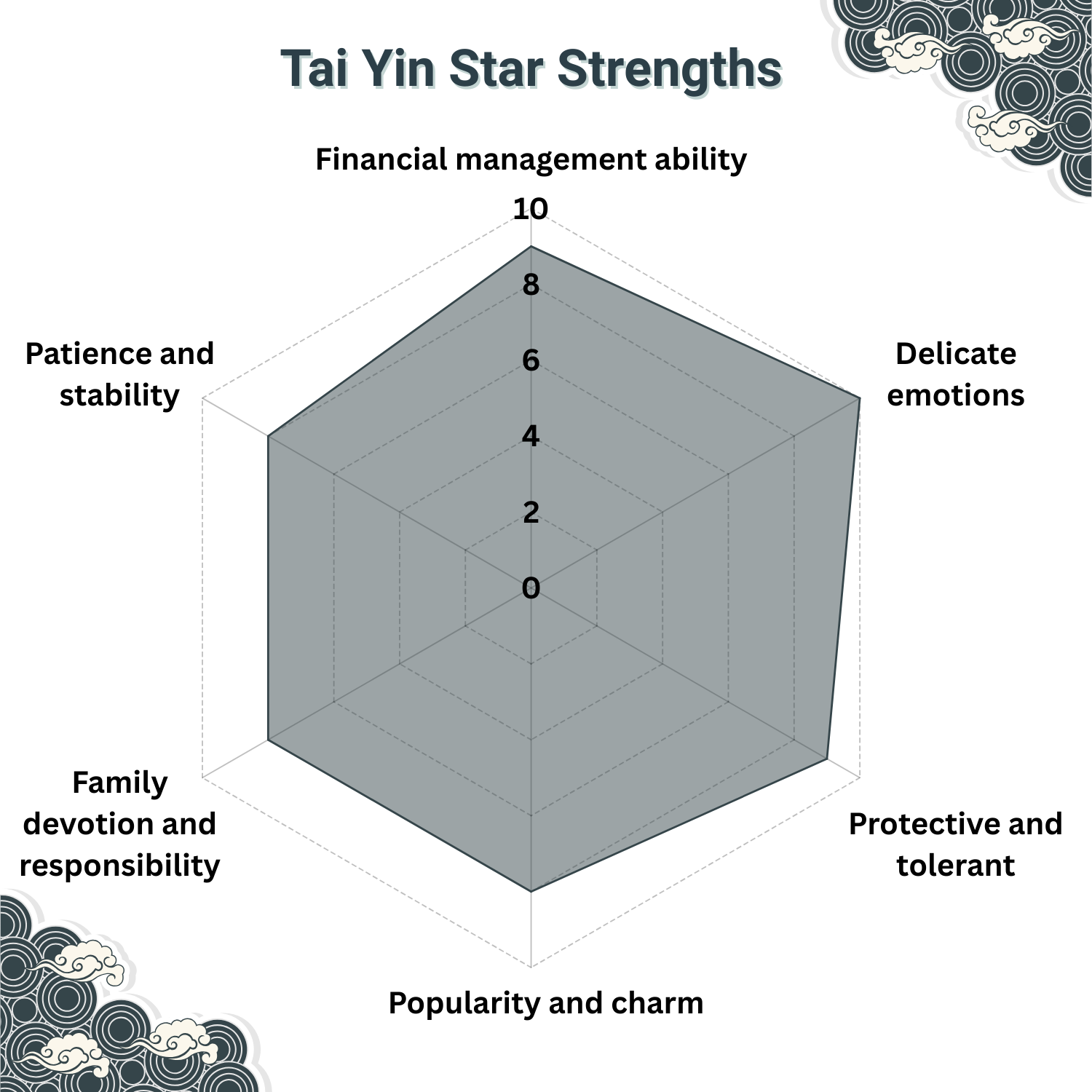 Like the moon, Tai Yin does not shine with blinding brilliance but with enduring gentleness. It embodies protection, shelter, and delicate care. Natives value family bonds and emotional connection, seeking prosperity not through sudden gain but through patience, planning, and persistence.