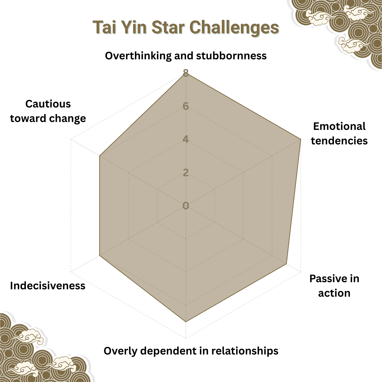 Due to their sensitivity, Tai Yin natives may become overly emotional or trapped in overthinking. Their actions may lean toward passivity, making them uneasy with change and causing missed opportunities.