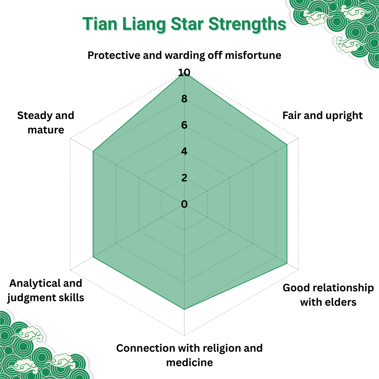 As one of the three major “Blessing Stars”, Tian Liang symbolizes elder protection, crisis resolution, and spiritual reliance. Like a steady elder figure, it reduces harm during difficulties and often turns setbacks into blessings.