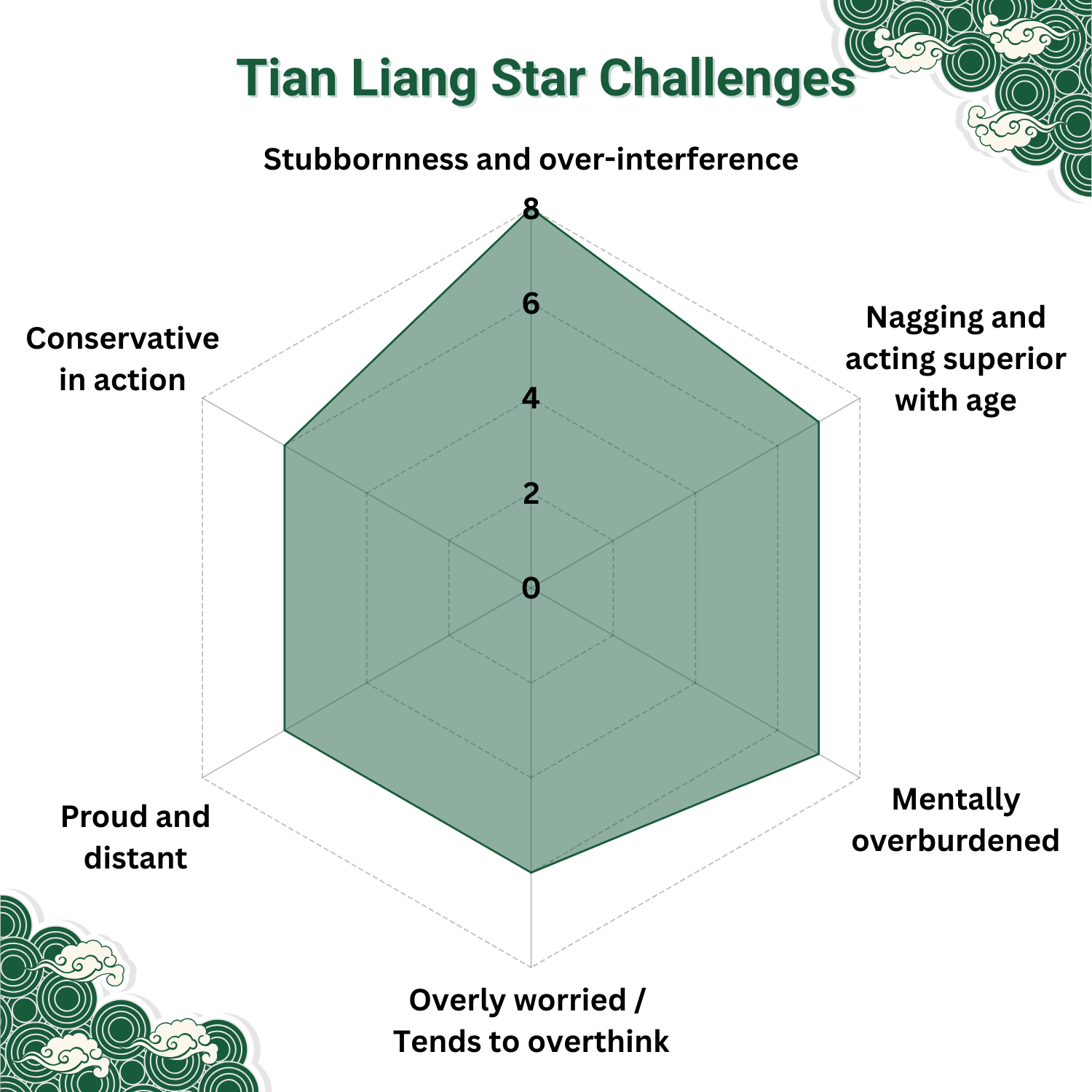When unbalanced, Tian Liang’s protective nature may be misinterpreted as meddling or patronizing. Their conservatism and tendency to overthink can slow action, causing missed opportunities. Over-concern for others may also leave them mentally overburdened.