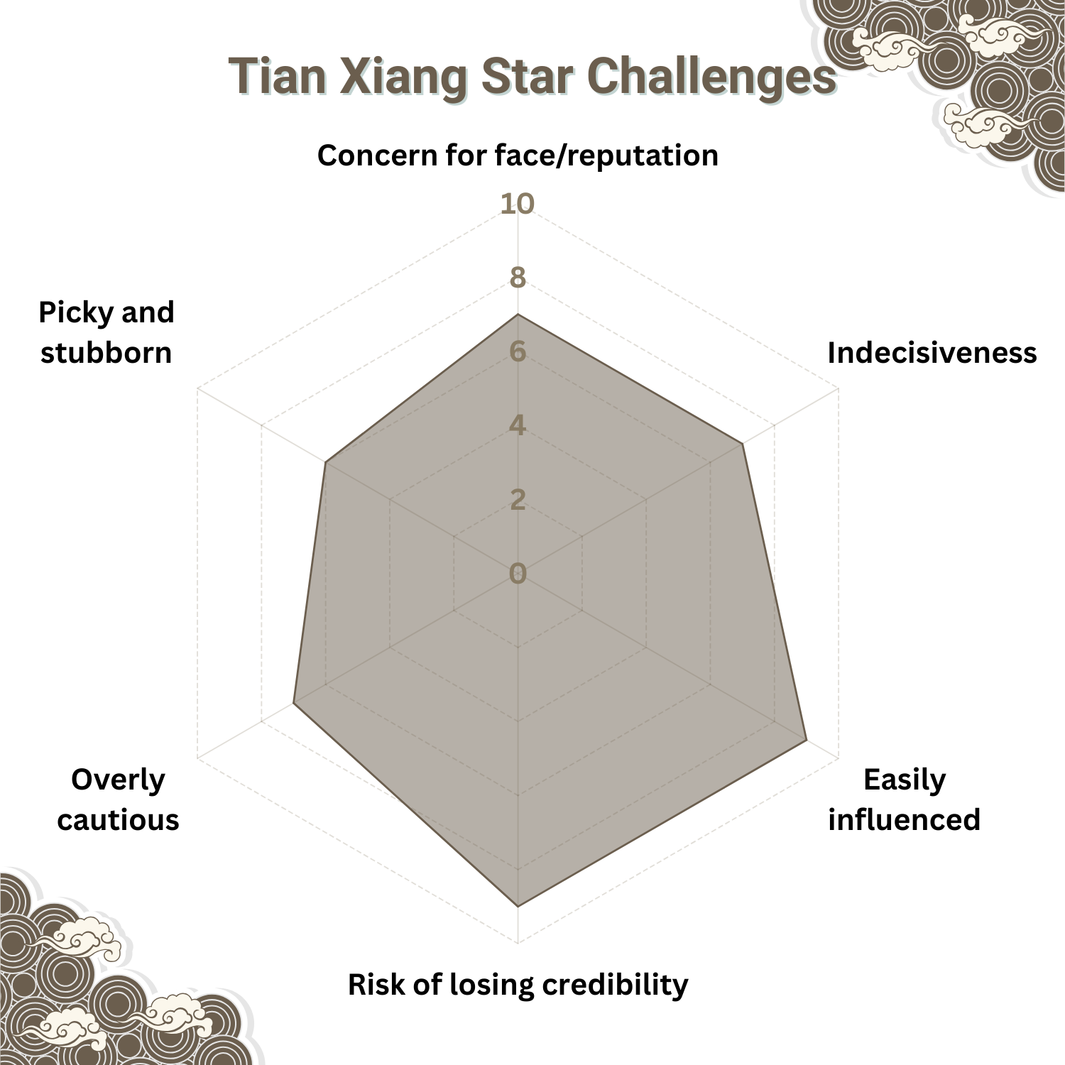 When afflicted, Tian Xiang may fall into the trap of over-commitment, insisting on promises even when fulfillment is impossible, thus damaging trust. They risk being perceived as unreliable or unyielding in cooperation. Learning to balance principles with flexibility is essential.