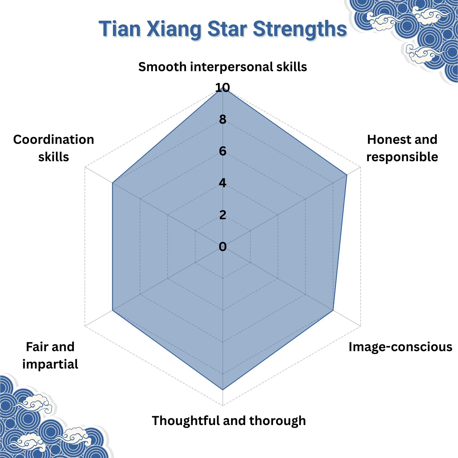 Tian Xiang natives are gentle yet upright, honest and responsible, with exceptional coordination and social management skills. Thorough and impartial, they become stabilizing forces in groups and organizations. By emphasizing detail and image, they can transform structure into efficiency and reliability, especially when supported by benefic stars.